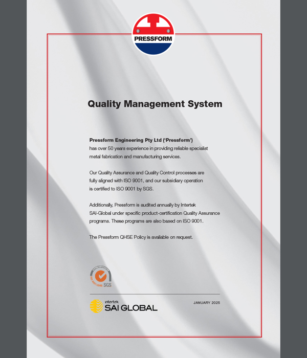 Pressform Engineering Pty Ltd (‘Pressform’) has over 50 years experience in providing reliable specialist metal fabrication and manufacturing services.